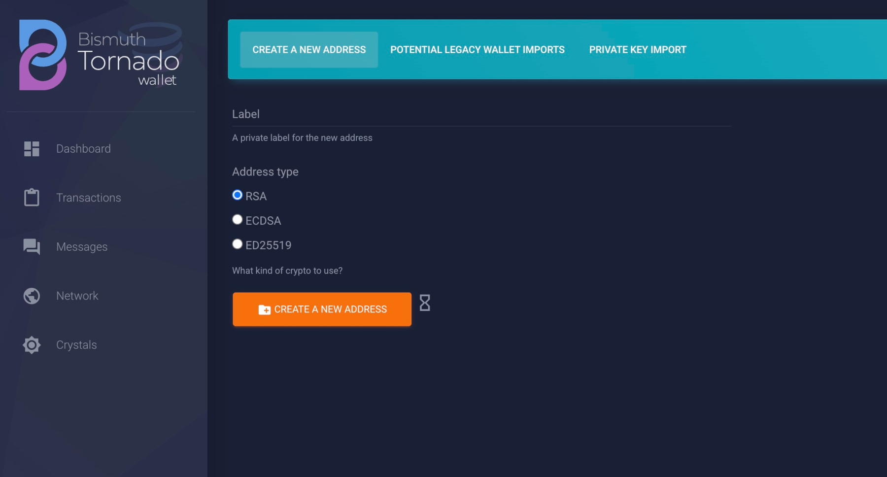 With the updated bismuthclient v0.0.55, Tornado Wallet now supports both ECDSA and ED25519 address schemes. Users can generate new wallet addresses in either format directly inside Tornado Wallet, giving more flexibility in how they manage their Bismuth accounts.