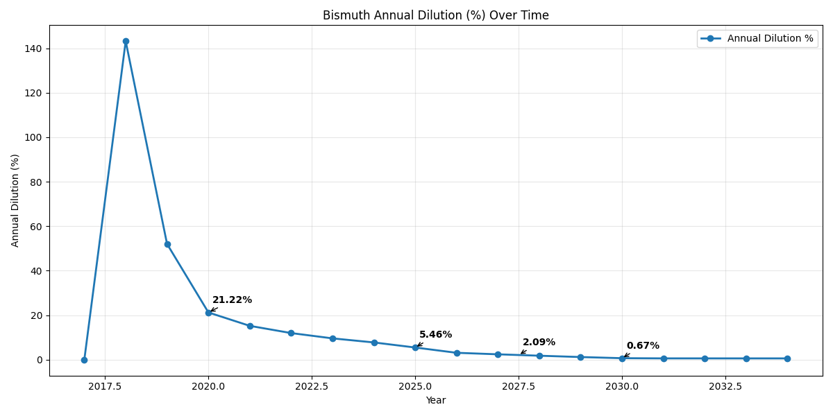 This graph (and CSV table) calculate Bismuth’s annual dilution rate, defined by: