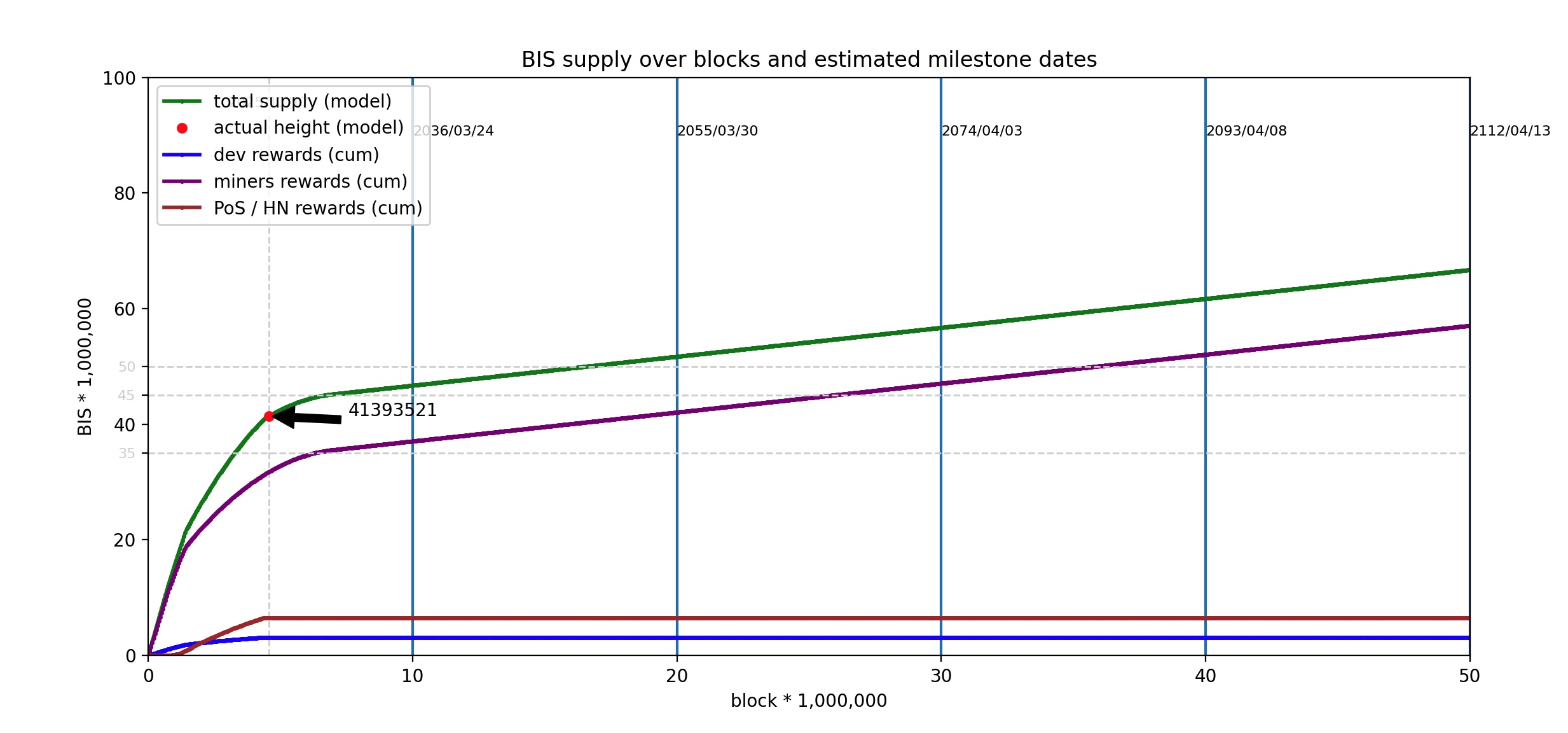 - The cumulative circulating supply of BIS from the genesis block (May 1st, 2017) to the far future.